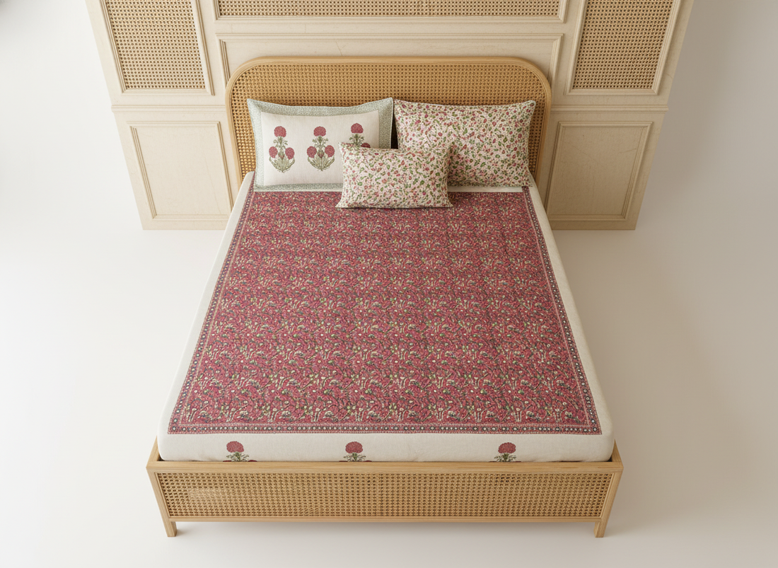 Crimson Flora Blockprint Percale Cotton King Size Bedsheet | 450 TC