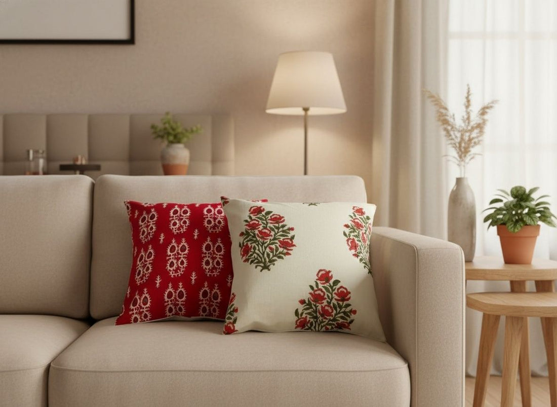 Rosy Bloom Hand Block Printed Cushion Cover - Set of 2