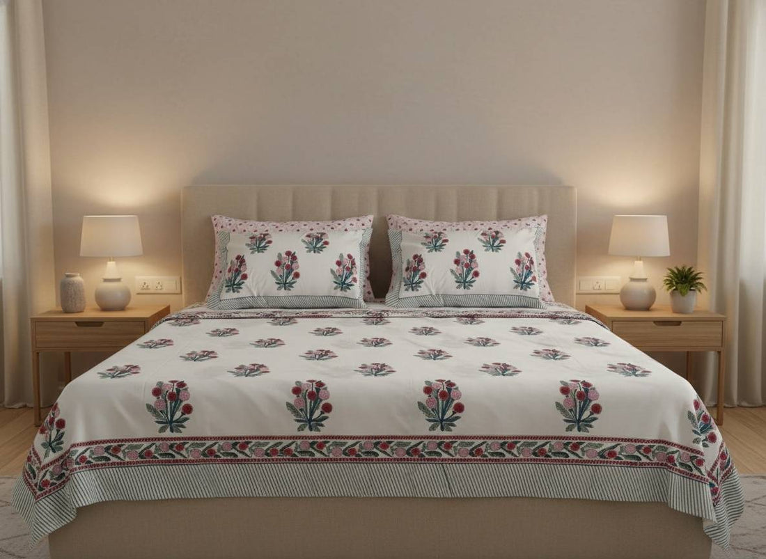 Phoolwari Blockprint Percale Cotton King Size Bedsheet | 450 TC