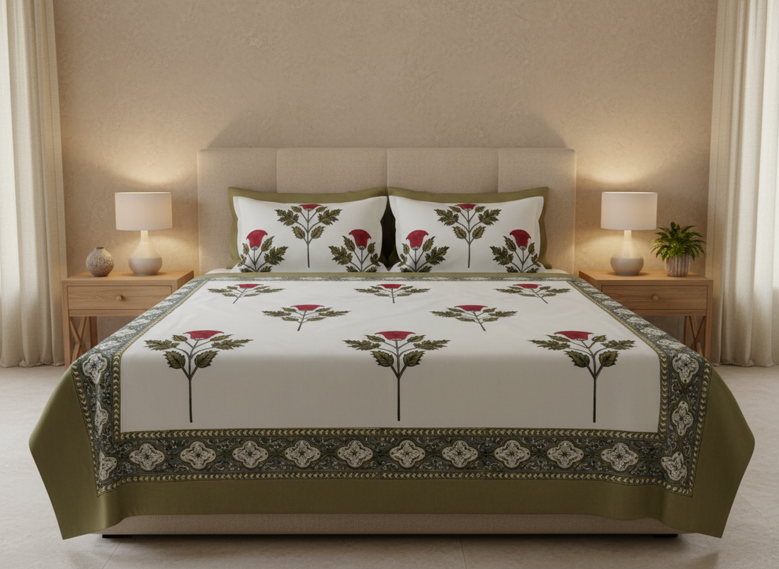 Bagh-e-Gul Blockprint Percale Cotton King Size Bedsheet | 450 TC