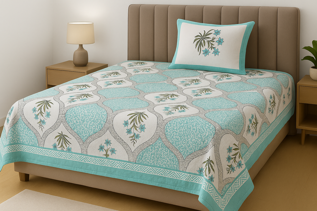 Teal Blossom Elegance Cotton Single Bedsheet