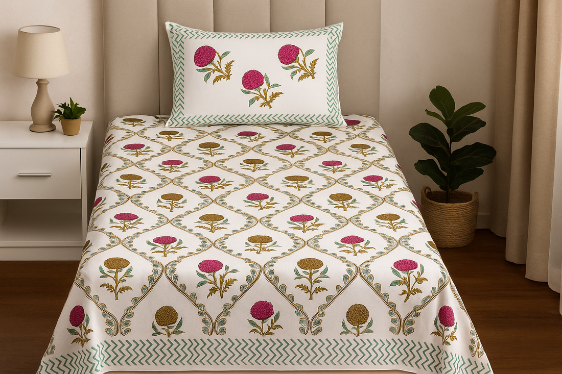 Traditional Jaipuri print single cotton bedsheet with 1 matching pillow cover Features intricate patterns and vibrant...