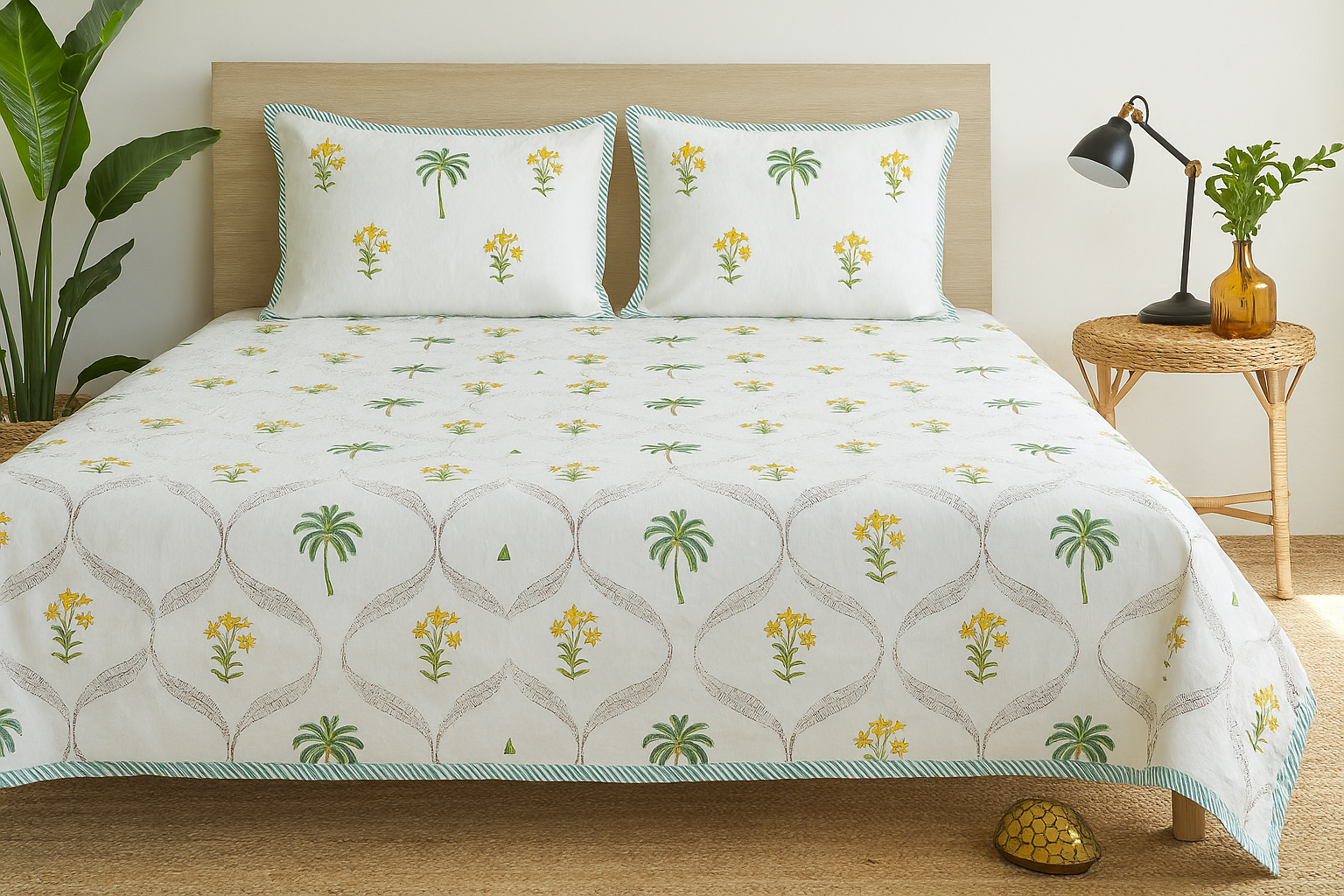 Gulmahal Hand Block King Size Premium Cotton Bedsheet - Yellow