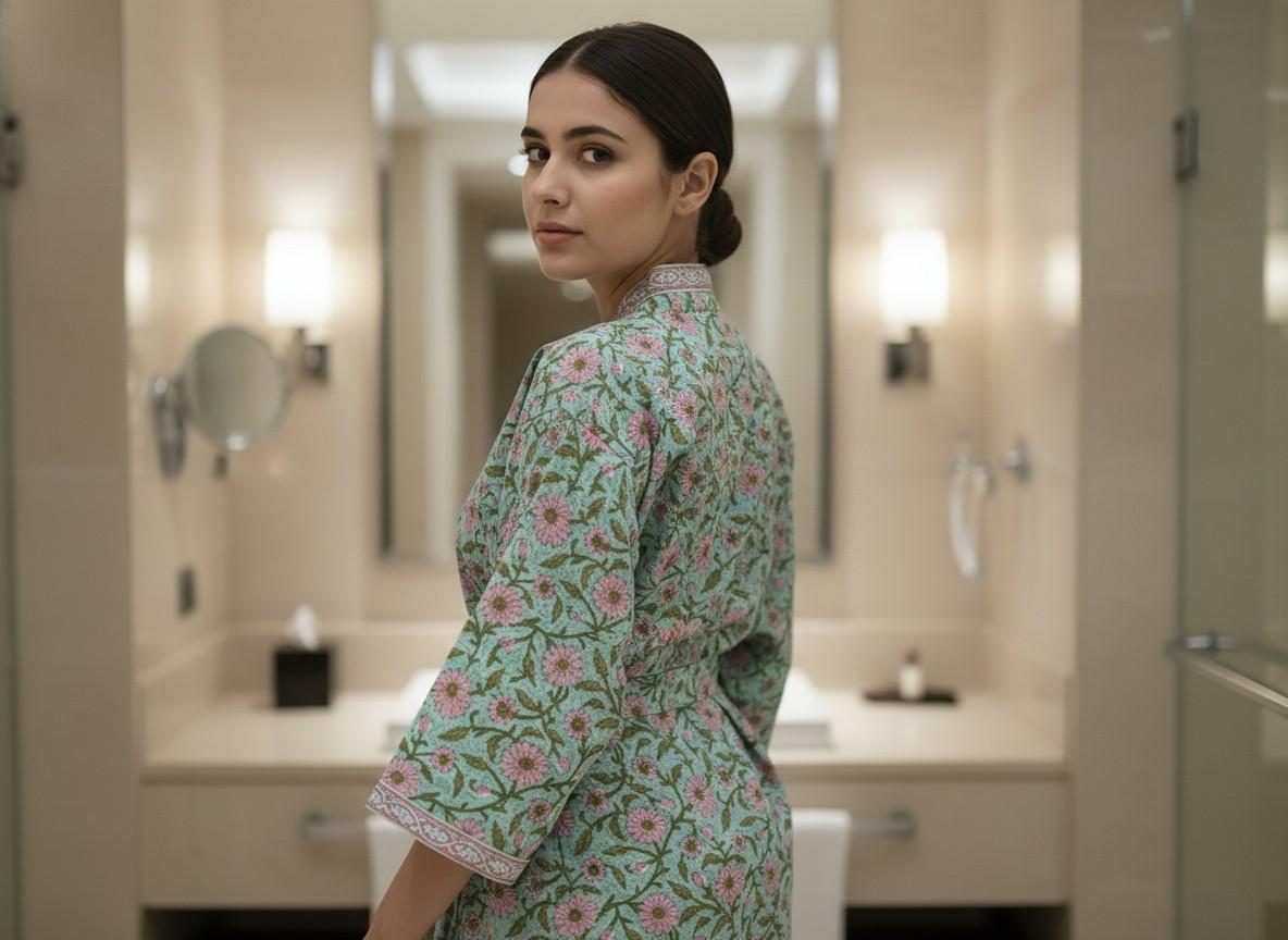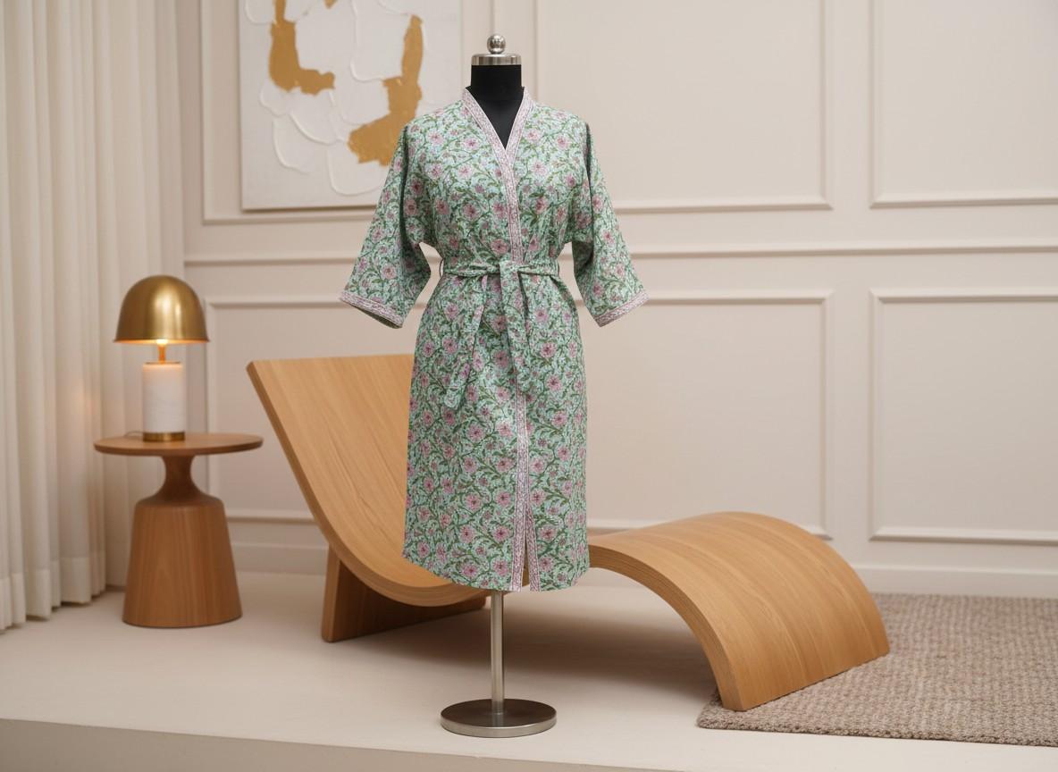 Stay comfy and stylish with our hand-block printed waffle cotton bathrobe. Lightweight, breathable, and unisex, it features two pockets and an adjustable belt for a perfect fit. Quick-drying and easy to wear for all adults.