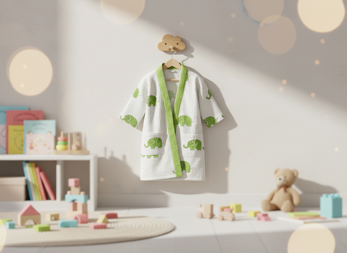 Experience a fun and comfortable bath time with our hand-crafted waffle cotton bathrobes, designed for kids. Made with lightweight, breathable material, each robe features two pockets and an adjustable waist belt for a secure fit.