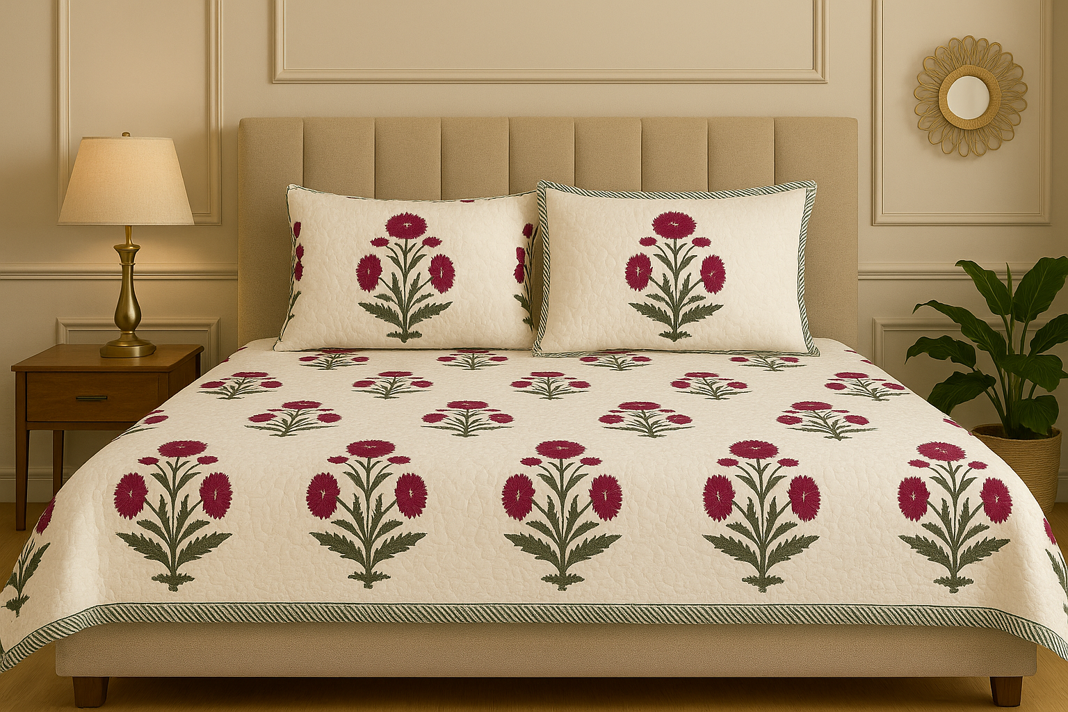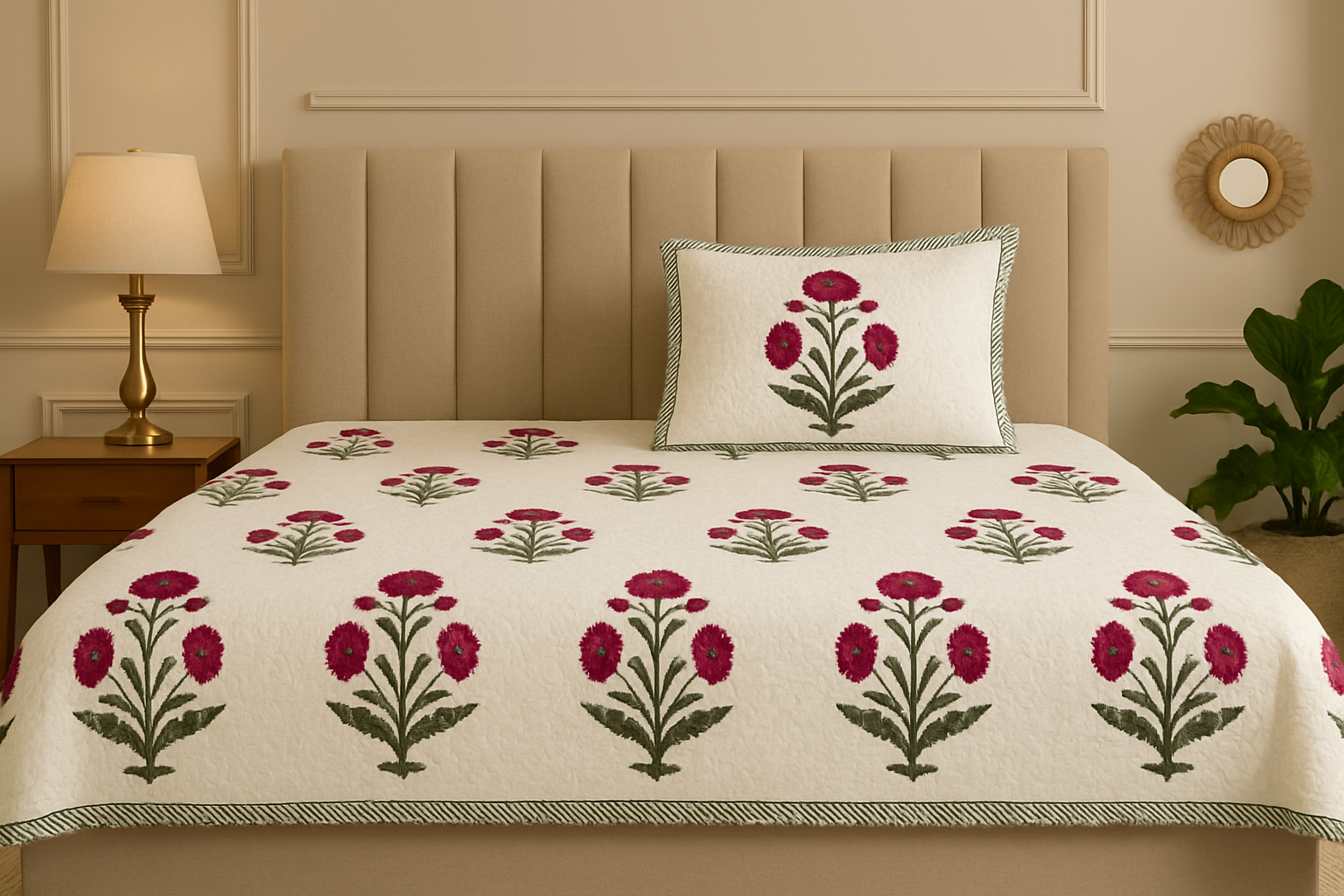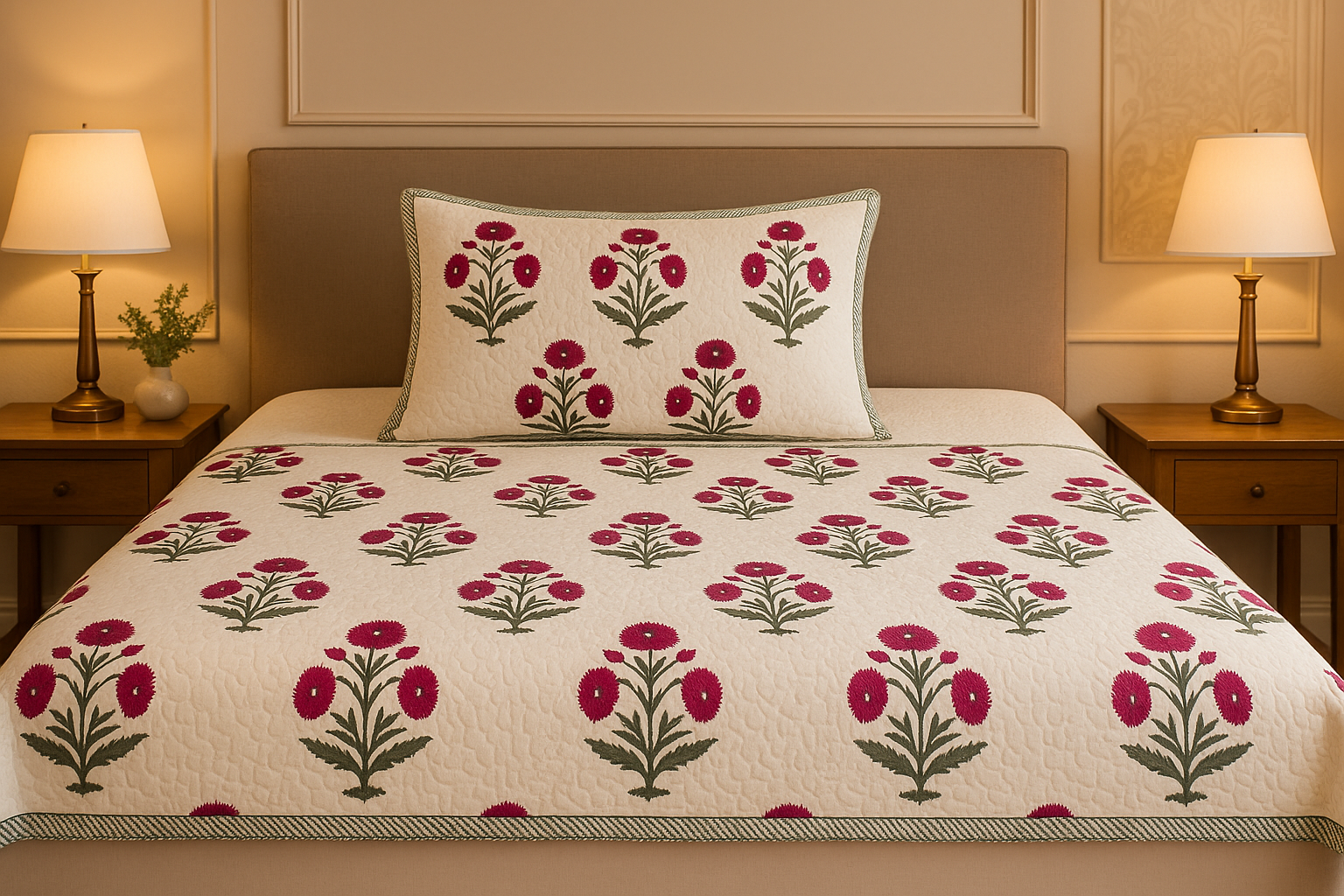 Showcases an elegant hand block print design that blends tradition with timeless style