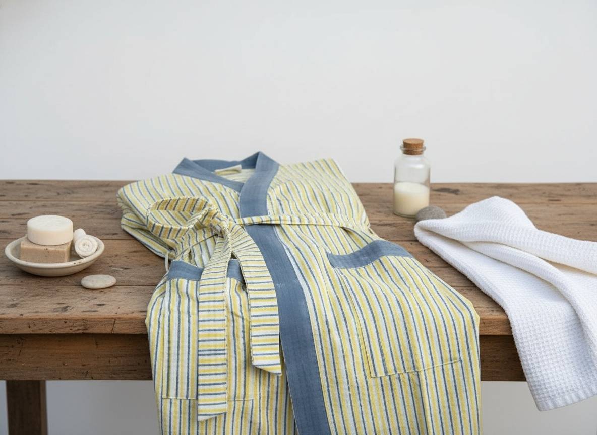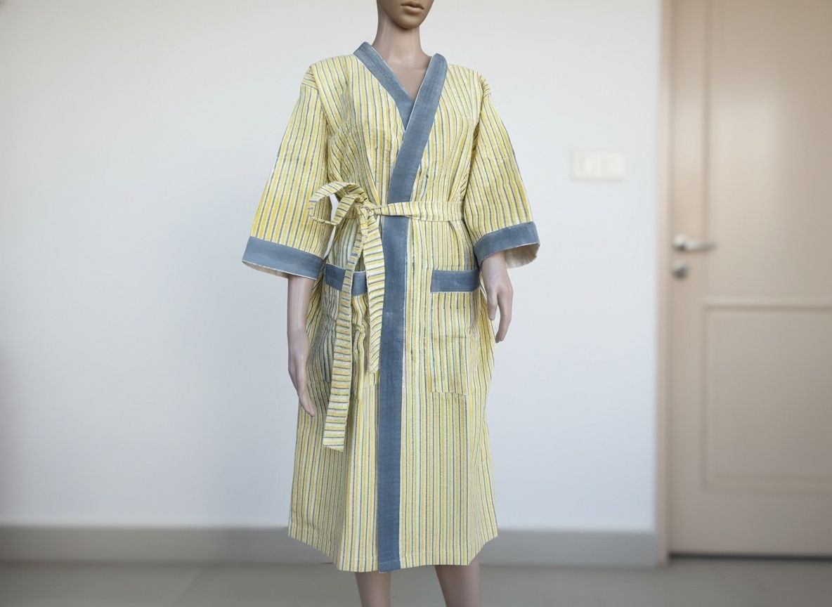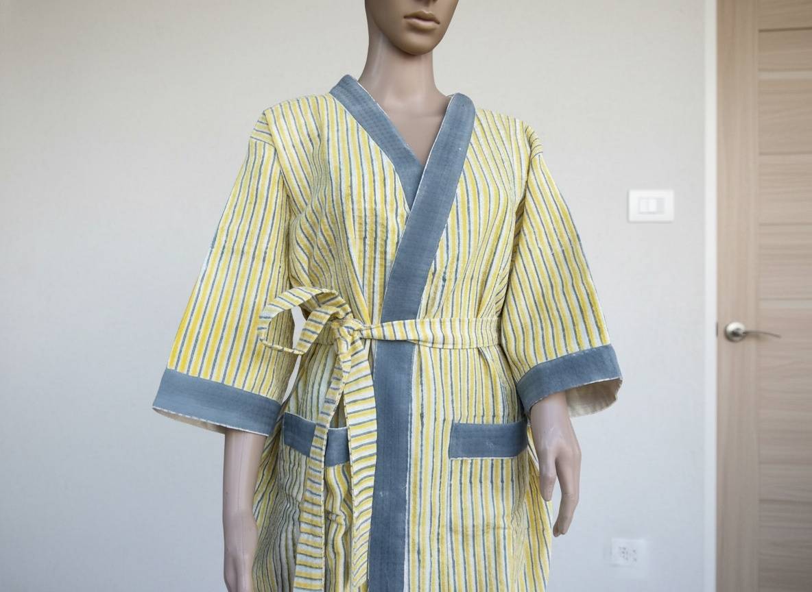 Stay comfy and stylish with our hand-block printed waffle cotton bathrobe. Lightweight, breathable, and unisex, it features two pockets and an adjustable belt for a perfect fit. Quick-drying and easy to wear for all adults.